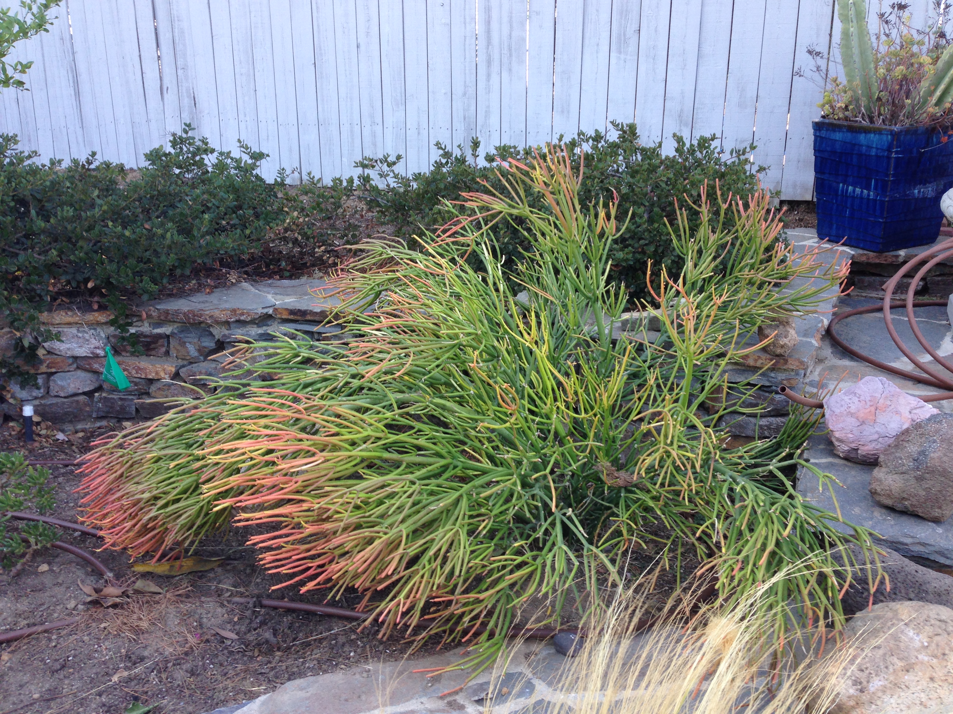 My euphorbia “Sticks on Fire” responds to the Santa Ana event by lying down (red tips are supposed to face skyward). It’s not broken, so maybe it knows something I don’t. Time for a break!